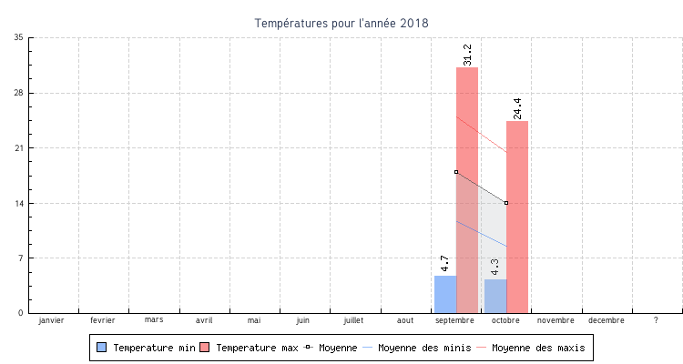 | octobre | 4.3 °C | 8.5 °C | 24.4 °C | 20.4 °C | 14.0 °C | 0.2 km/h | 5.5 km/h | 264 |